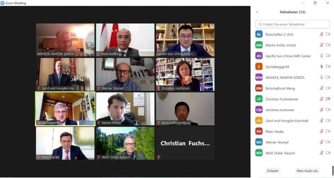 4月26日,李曉駟大使應(yīng)邀出席奧中經(jīng)貿(mào)協(xié)會(ACETA)線上交流活動,與奧地利前副總理、協(xié)會主席施賓德艾格、維也納市政委員漢克、奧中友協(xié)常務(wù)副主席卡明斯基、ACETA成員、奧聯(lián)邦商會及部分企業(yè)代表就中國疫情防控、經(jīng)濟形勢、“十四五”規(guī)劃和2035年遠景目標及中奧關(guān)系等交換意見。使館孟繁壯經(jīng)商參贊出席。中國中小企業(yè)中心總經(jīng)理孫海龍應(yīng)邀參會。
