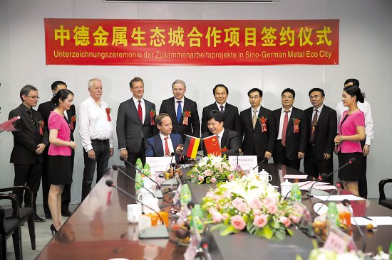 在創(chuàng)園之初,中德金屬生態(tài)城就已經(jīng)和多家來自德國的企業(yè)達成了入園投資意向。國家主席習(xí)近平訪問德國期間與德國總理默克爾共同發(fā)表《建立中德全方位戰(zhàn)略伙伴關(guān)系的聯(lián)合聲明》,并見證了中德雙邊合作文件的簽署,涉及汽車、信息化、金融、節(jié)能環(huán)保等多個領(lǐng)域。其中,來自中德金屬生態(tài)城的“中德資源再生基地”項目為十個簽約的經(jīng)濟項目中來自廣東的唯一項目。10月,國家總理李克強出訪德國柏林,與德國總理默克爾等中德政府高級官員和兩國經(jīng)濟界人士共同出席第七屆中德經(jīng)濟技術(shù)合作論壇。作為與德合作的示范企業(yè),中德金屬集團與阿德勒斯霍夫科技園區(qū)管理機構(gòu)維斯塔公司簽署共建中德金屬生態(tài)城合作協(xié)議,與達姆施塔特工業(yè)大學(xué)IWAR研究所簽署中德金屬生態(tài)城分質(zhì)水處理及資源化利用項目合作協(xié)議,成為此次論壇中唯一一個成功簽約兩個項目的單位。