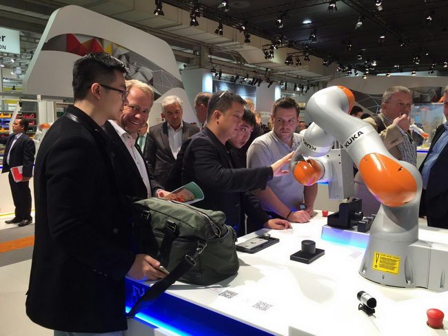 KUKA 公司設(shè)計的自主移動機(jī)器人,既可作為工業(yè)生產(chǎn)助手,也可作為家務(wù)助手,成為考察團(tuán)的一大看點(diǎn)