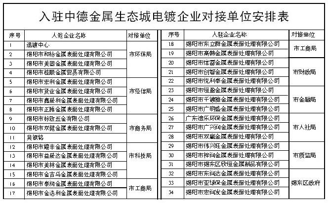 為貫徹落實(shí)全市電鍍產(chǎn)業(yè)發(fā)展推進(jìn)會(huì)會(huì)議精神,全力加快中德金屬生態(tài)城電鍍園區(qū)建設(shè),努力打造綠色電鍍產(chǎn)業(yè)高地,全市各地各部門主動(dòng)作為,加強(qiáng)協(xié)調(diào),形成合力,結(jié)對(duì)支持,切實(shí)幫助入駐園區(qū)電鍍企業(yè)解決投產(chǎn)建設(shè)過(guò)程碰到的各項(xiàng)問(wèn)題,助推企業(yè)盡早投產(chǎn)運(yùn)營(yíng)。根據(jù)安排,市環(huán)保、經(jīng)信、商務(wù)等部門和揭東區(qū)政府等十家單位將對(duì)首批34家入園電鍍企業(yè)進(jìn)行結(jié)對(duì)支持。