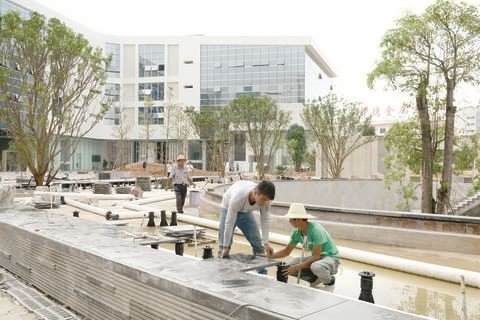 鋪貼石板、種植綠化、修筑景觀水池……國慶期間,中德金屬生態(tài)城四大中心工程中庭園林施工現(xiàn)場一派繁忙,工人有條不紊地推進(jìn)各項施工。